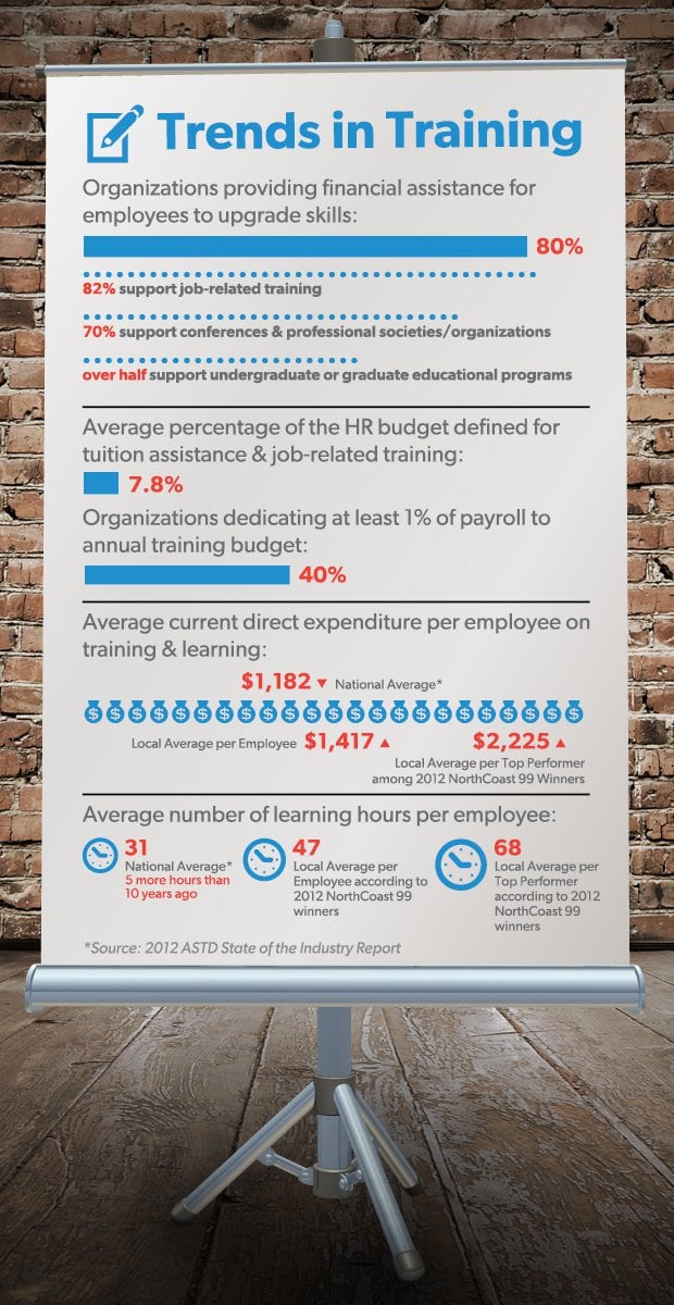 ERC’s research, in addition to national research, shows that organizations are continuing to make strong investments in training. Specifically, consider the following statistics taken from our 2012 ERC/Smart Business Workplace Practices Survey, 2012 ERC Talent Management Practices Survey, and 2012 NorthCoast 99 Winners Report.